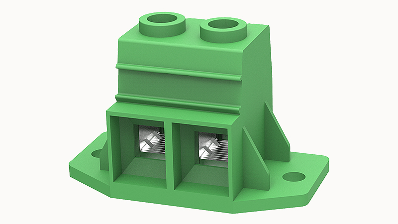 Клемма для печатной платы c шагом 15 мм, 2 полюса, цвет - зелёный, номинальное напряжение - 1000 B, номинальный ток - 115 А, тип подключения - винтовой зажим, монтаж - пайка волной припоя, угол между проводником и печатной платой - 0°, сечение проводника от 4,0 до 35 мм², длина зачистки изоляции - 18 мм, материал контакта - медь, покрытие контакта - луженый, материал корпуса - полиамид 6.6, класс воспламеняемости - V0, температура окружающей среды при эксплуатации от -40°C до +105°C