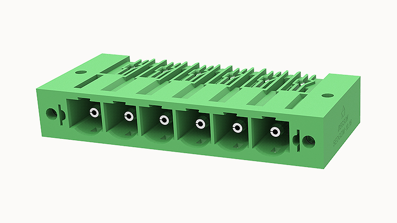 Разъем для печатной платы с шагом 10,16 мм, количество полюсов - 6, цвет - зелёный, номинальное напряжение - 600 В, номинальный ток - 57 А, тип разъёма - папа (male), материал поверхности контакта - серебро, тип монтажа - пайка волной припоя, угол между контактами и печатной платой - 0°, фиксация винтом