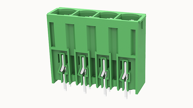 Разъем для печатной платы с шагом 10,16 мм, количество полюсов - 4, цвет - зелёный, номинальное напряжение - 600 В, номинальный ток - 57 А, тип разъёма - папа (male), материал поверхности контакта - серебро, тип монтажа - пайка волной припоя, угол между контактами и печатной платой - 90°